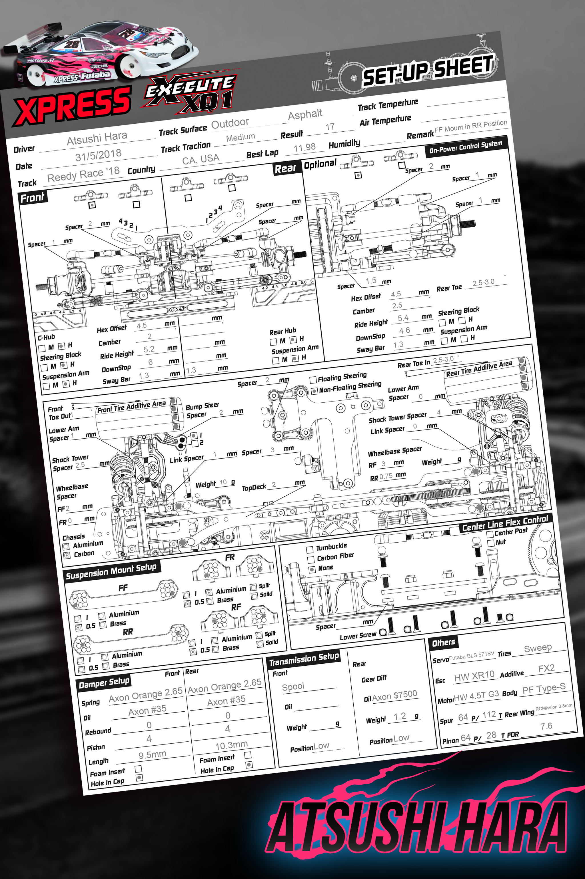 Upon receiving the XQ1 Kits, Hara quickly built up two kits. One to run our XOC dynamic rear toe in system and one with your traditional rear hub. Hara only got to run 6 packs due to bad weather before leaving for America.
