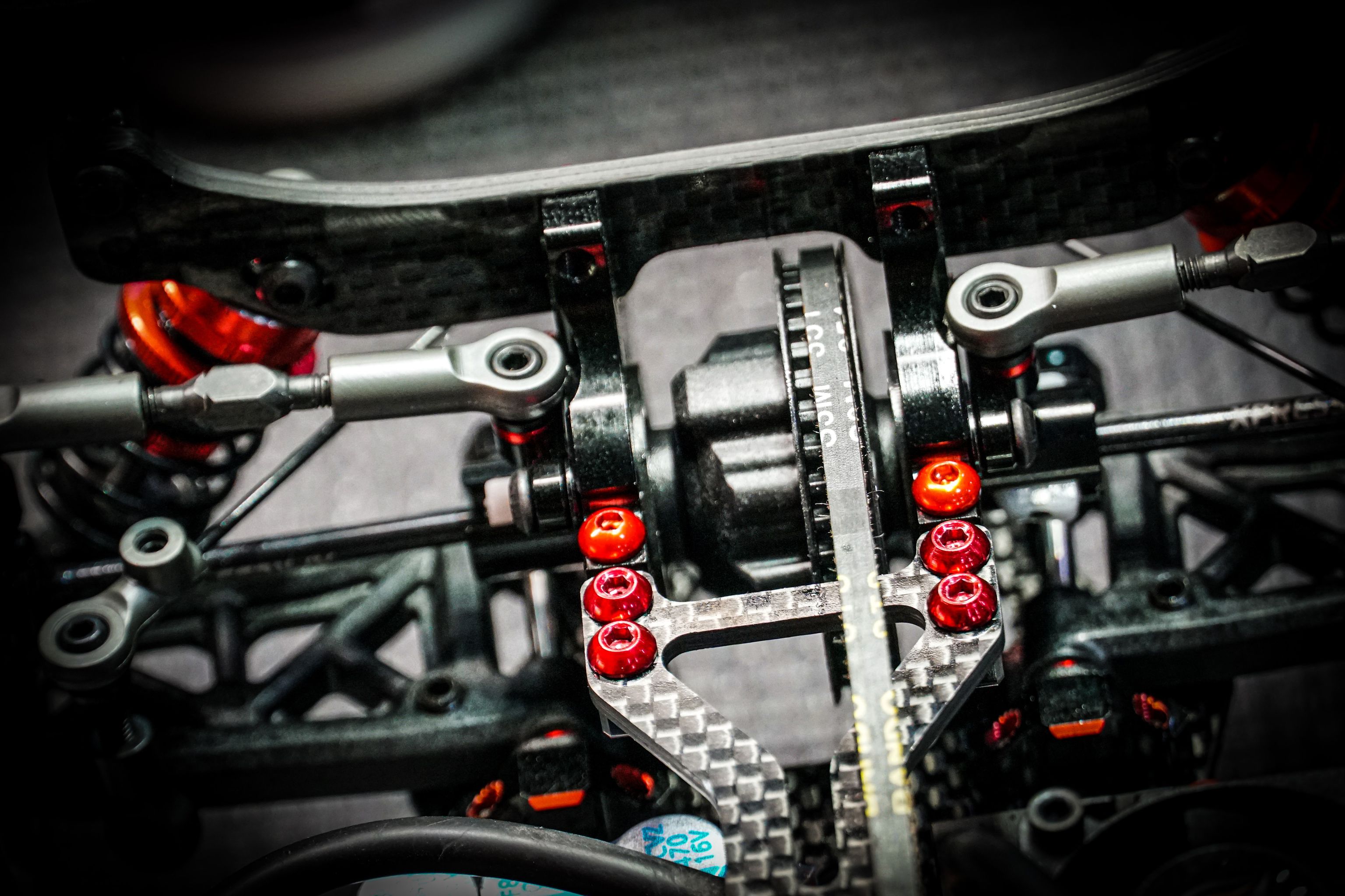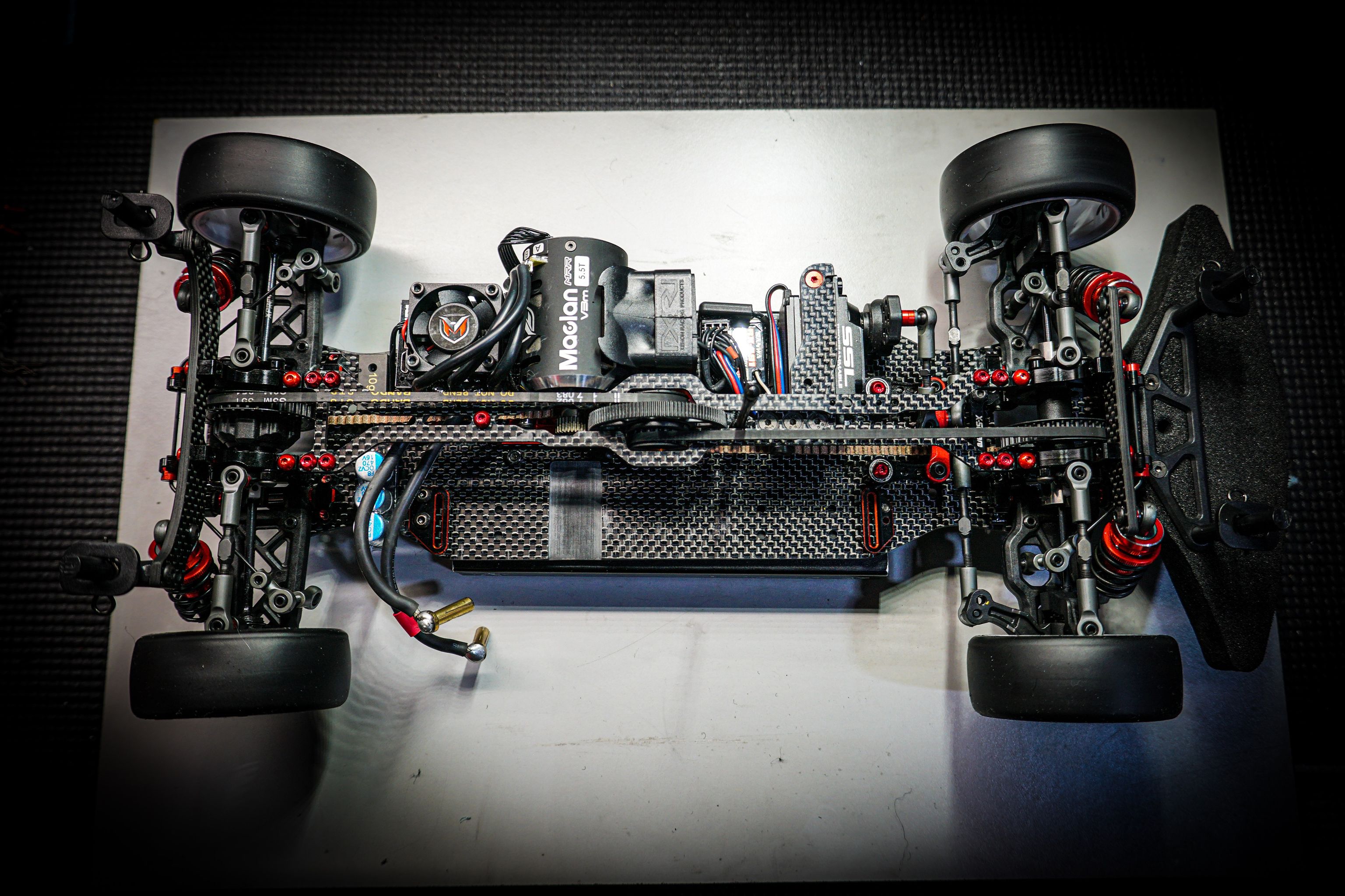 Fairly standard affairs in the front, Felix opted for a servo saver to protect his expensive servo against the track barriers. The Titanium outdrives were chosen for their lightweight and durable as they cover the whole blade!