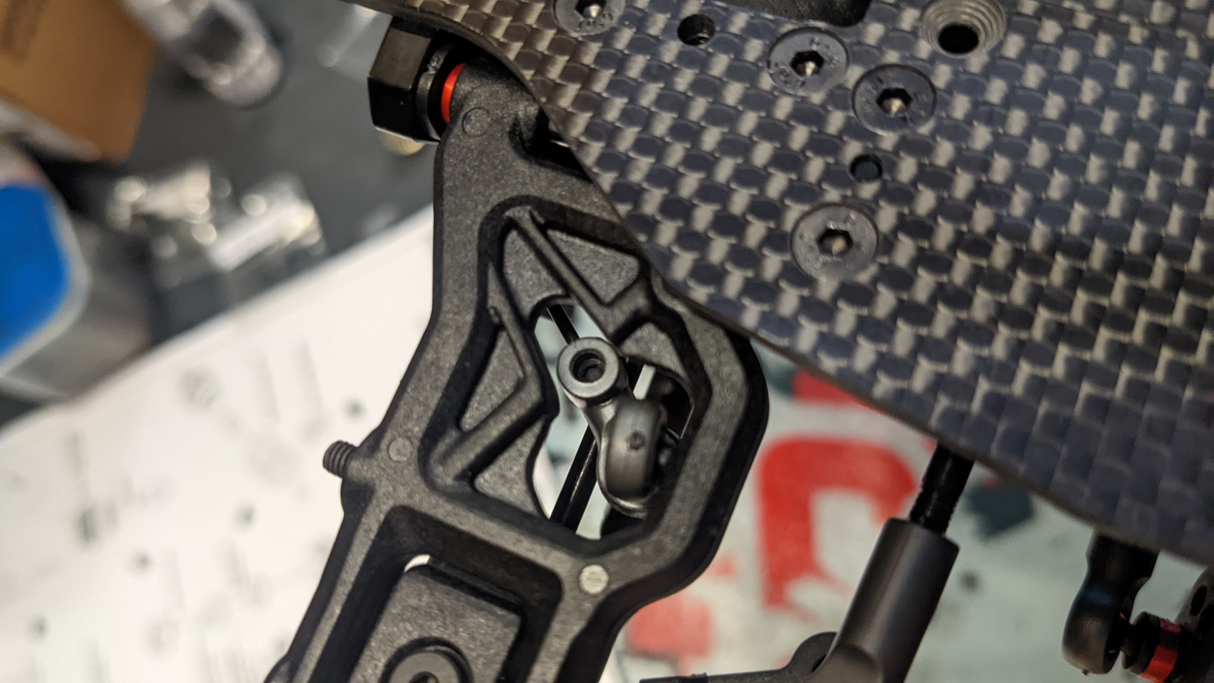 The carbon camber link plates are also a fantastic addition and certainly lower (a smidge) the CoG of this car. Changing shims for roll centres may prove to be less easy as per the previous generation of Xpress cars, due to the pivot ball screwing into a countersunk screw (which is underneath). So it could be a whole camber plate off job or you’ll end up with some loose camber. Great if you like some free floating camber gain… but bad if you want things to be consistent throughout a run. You can also see the carbon shims used to bring the top deck up. I haven’t checked if you can drop these off and run the top deck flat on the bulkhead housing, but I will at some point!