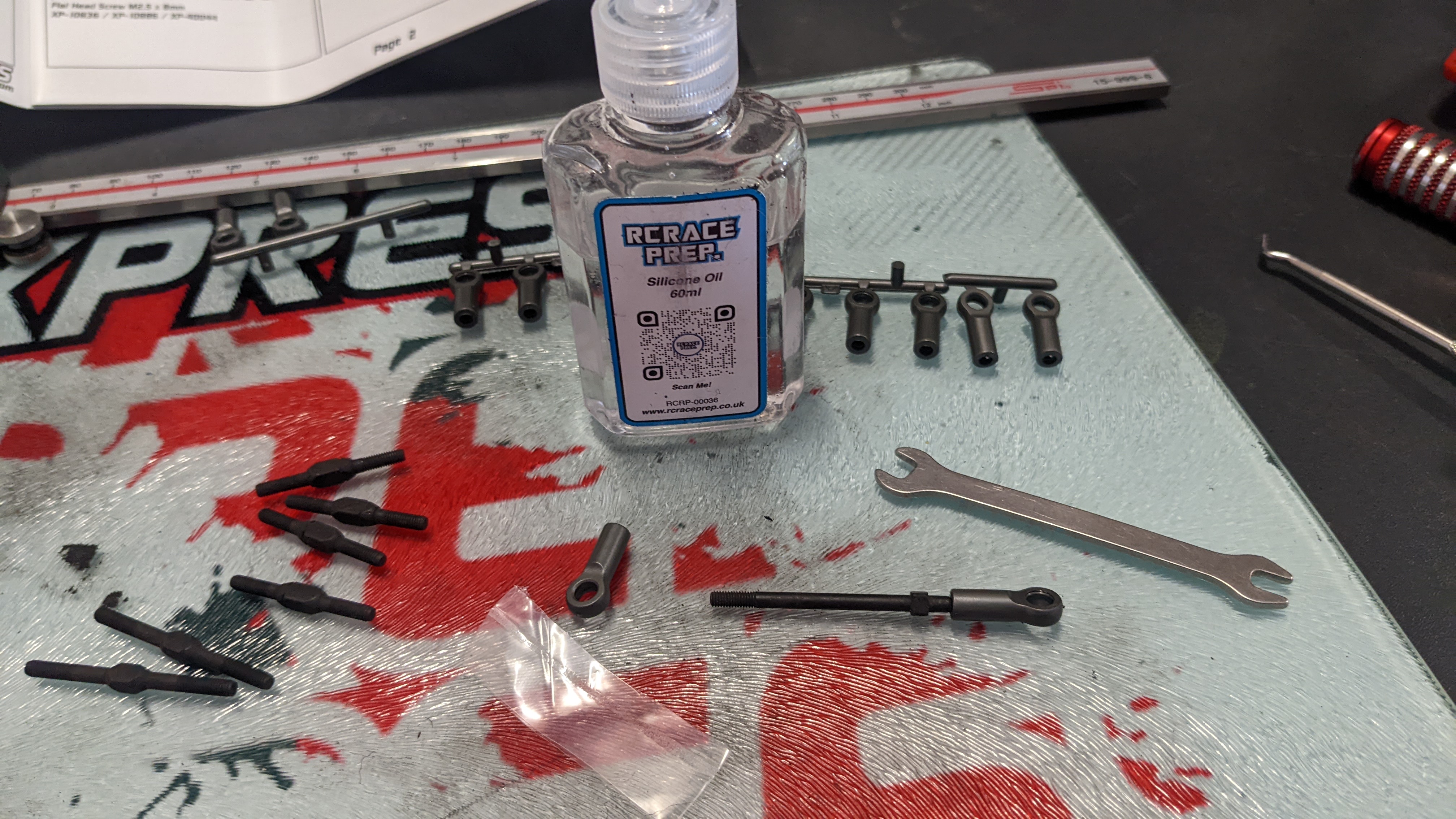 First things to build were the dreaded turnbuckles. Others have their own way of making sure they screw together easily, using chapsticks, soap and even ceramic lube! Personally, I always use some RCRacePrep diff oil. Yes it leaks out and dries, but that's fine as then the turnbuckle is less likely to need adjusting after a run.