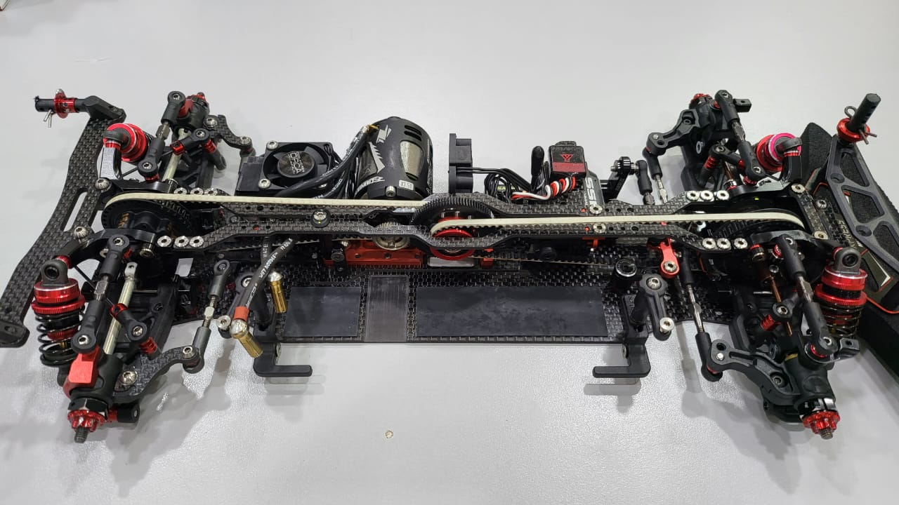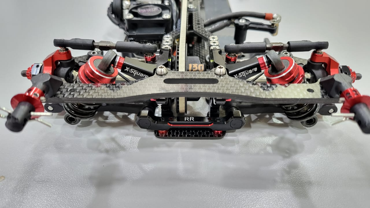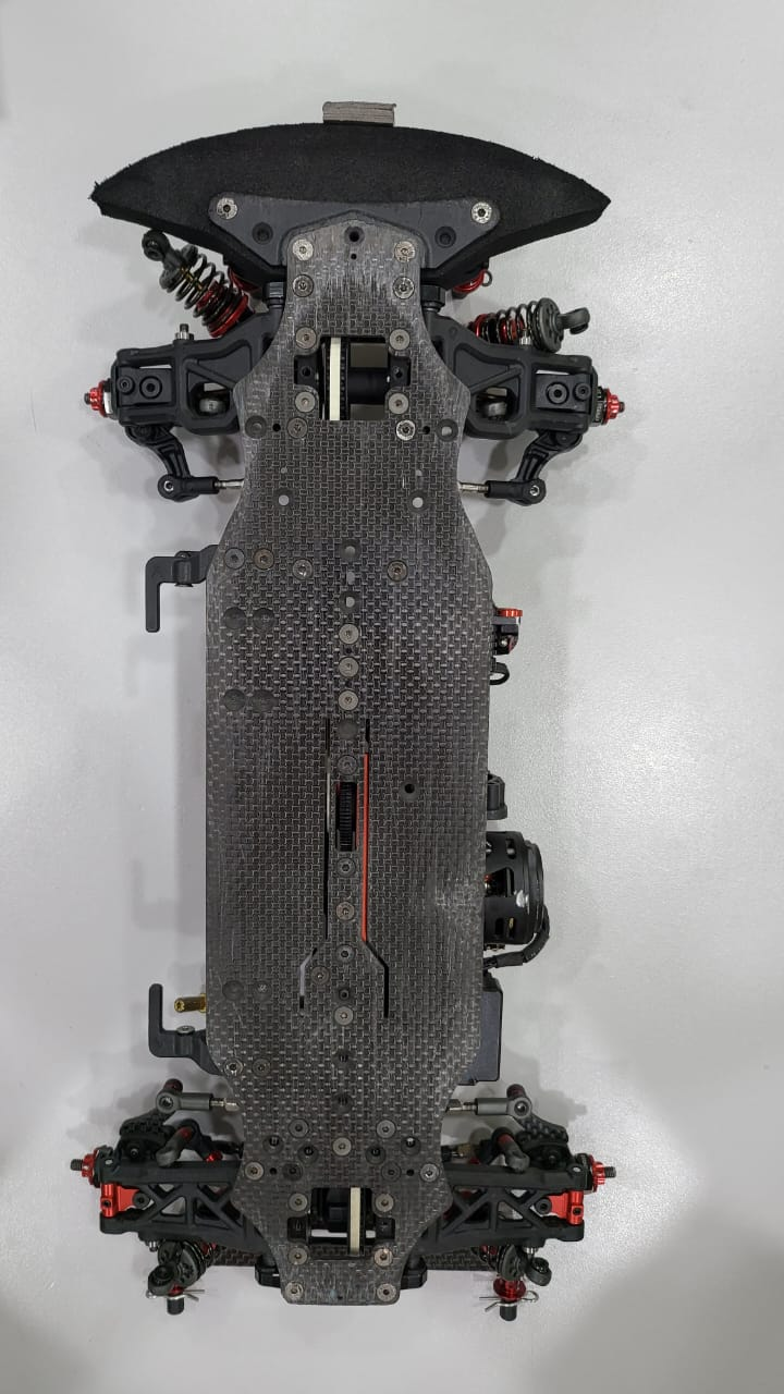 Top view of his chassis, like all serious racers, the X-Square lower profile upper bulkheads were his choice.
