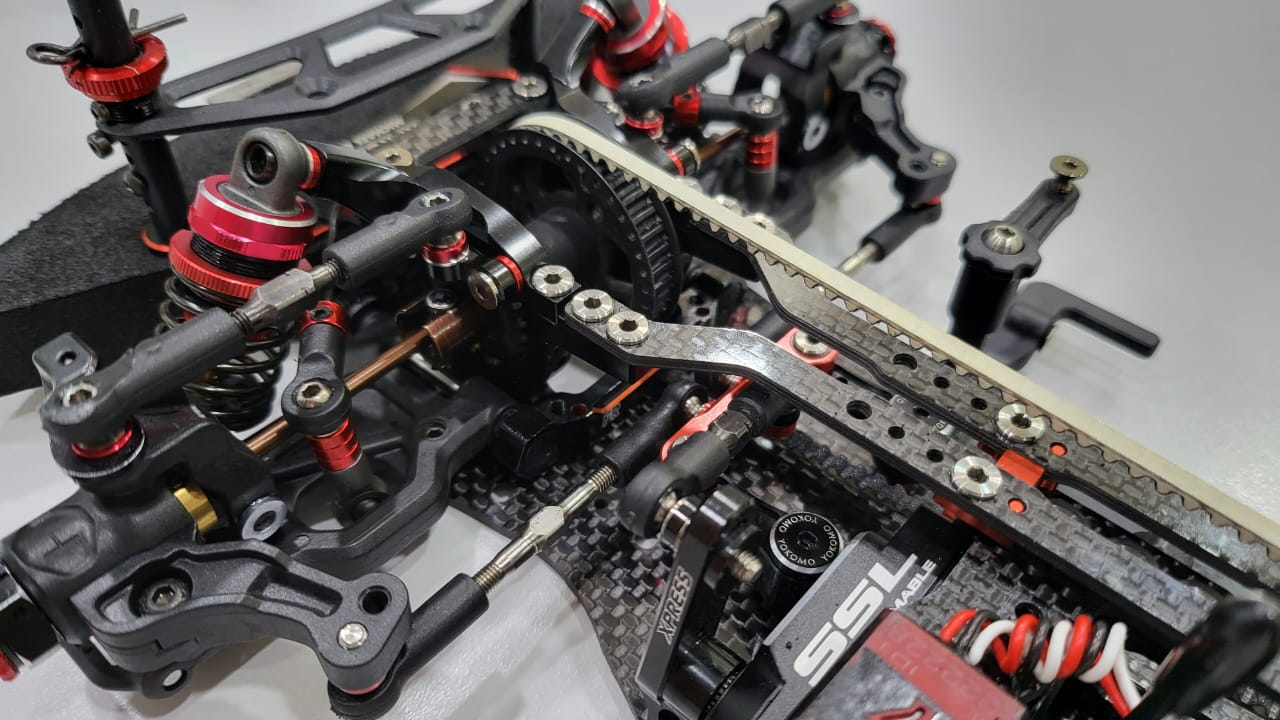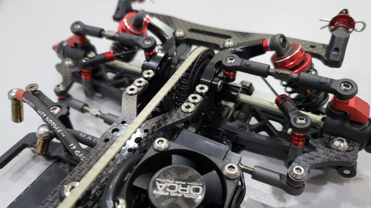 A look at the front end, with using shims to ensure the same length on the links for the rollbars. Fairly stiff topdeck stiffener position.