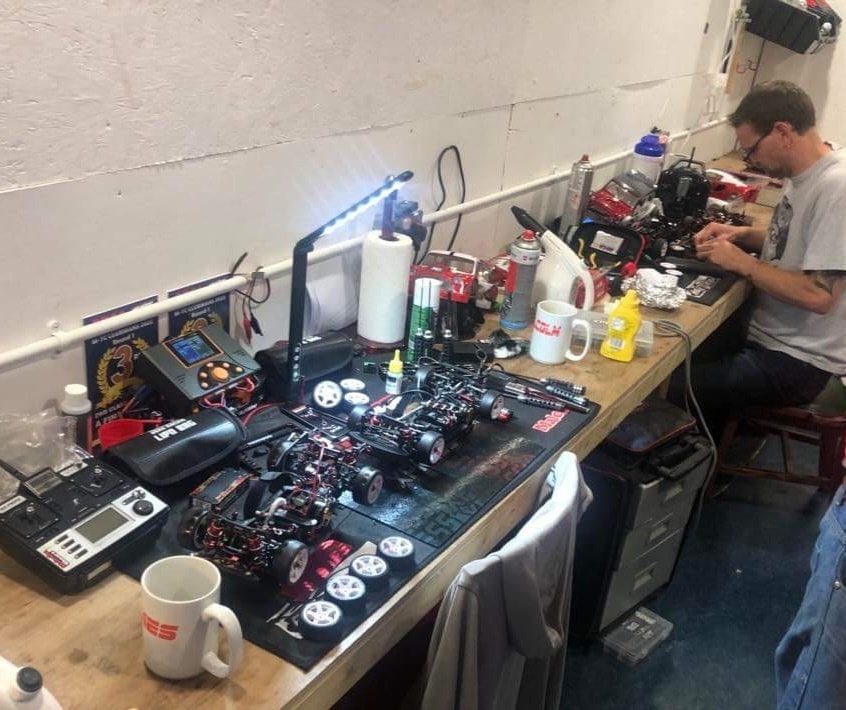 Racing carpet can be damaging to the chassis with wooden barriers, so it's good to have two cars instead of rushing to repair things between rounds.