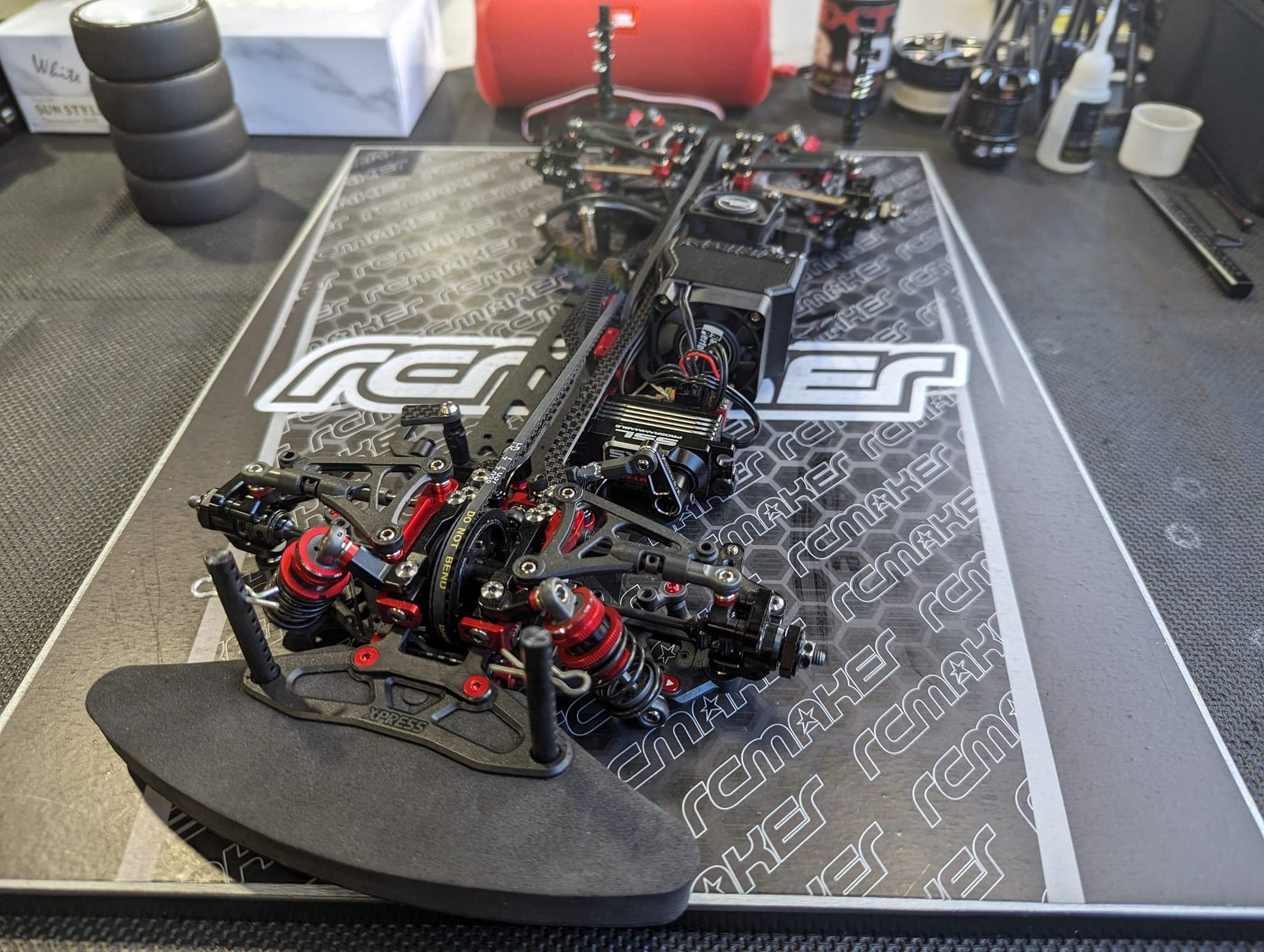 The Aluminum chassis was the choice to give much needed consistency on the high grip permanent carpet track.